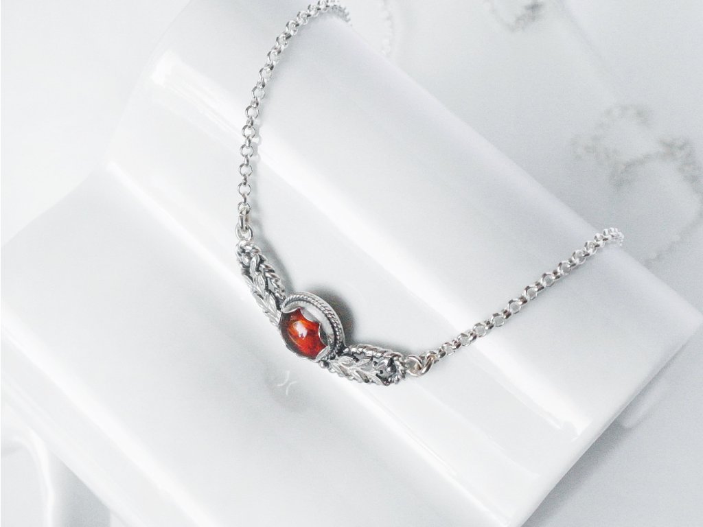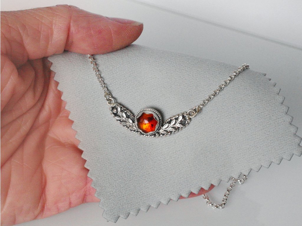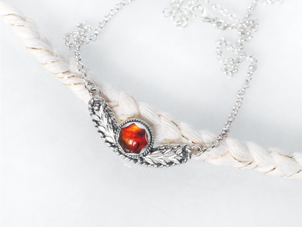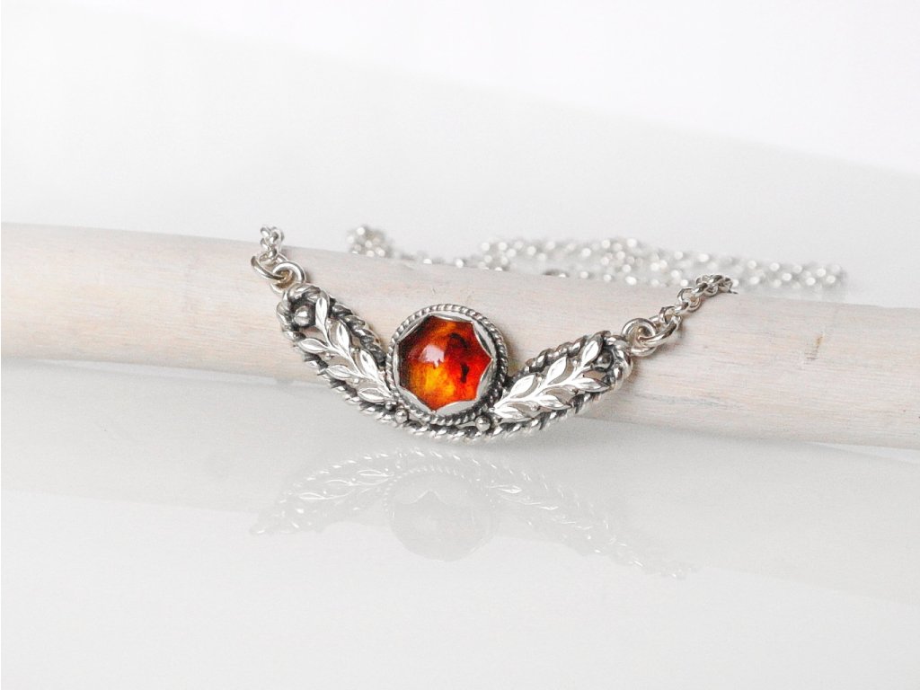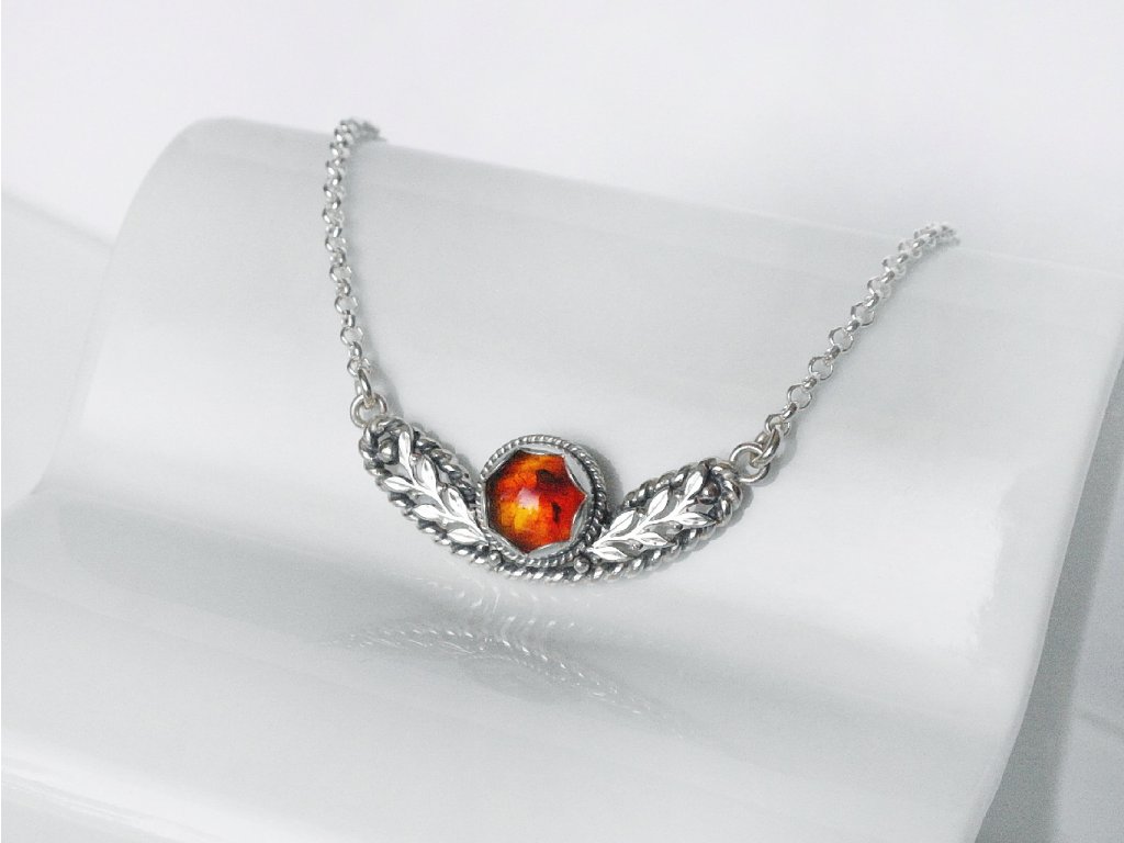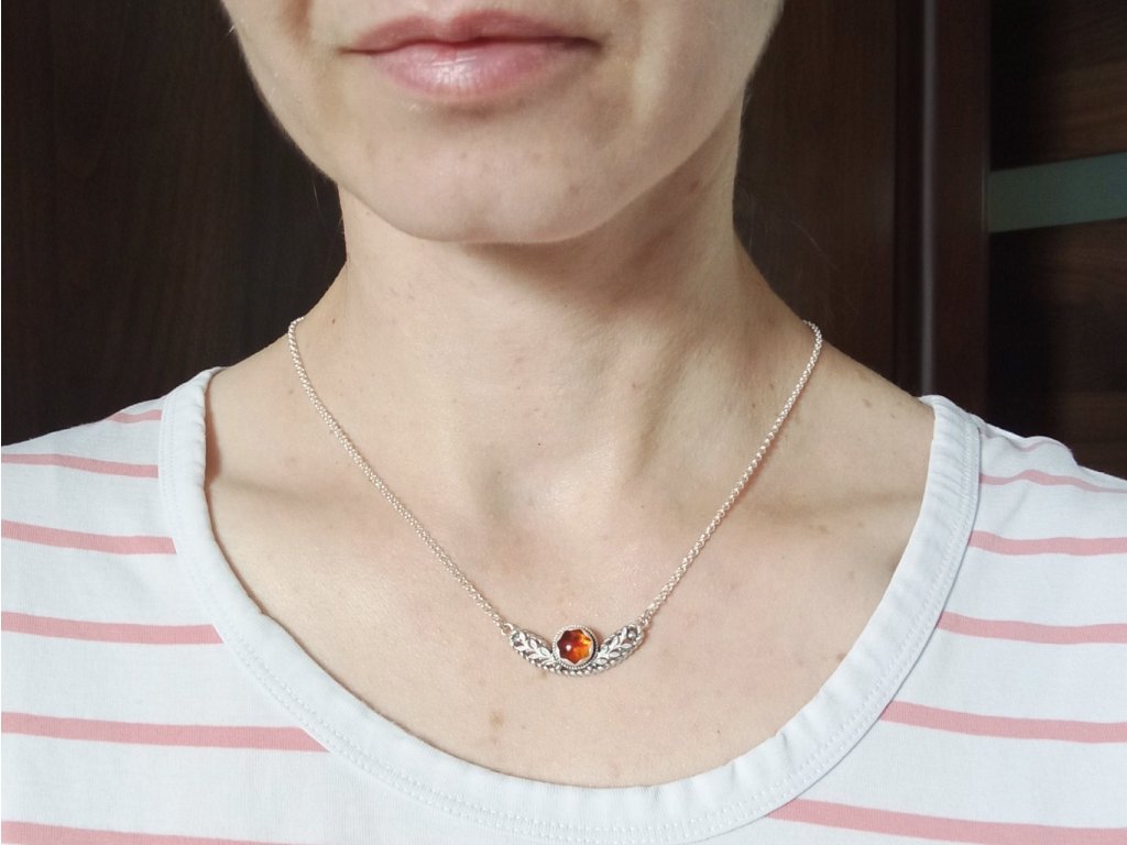 - uprostred je okrúhly kabošón 8mm prírodného baltického jantáru, osadený v obrube s oblúčikmi čím pôsobí ako otvárajúci sa púčik ❀ od ktorého sa tiahnu strieborné vetvičky s lístkami