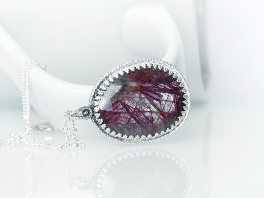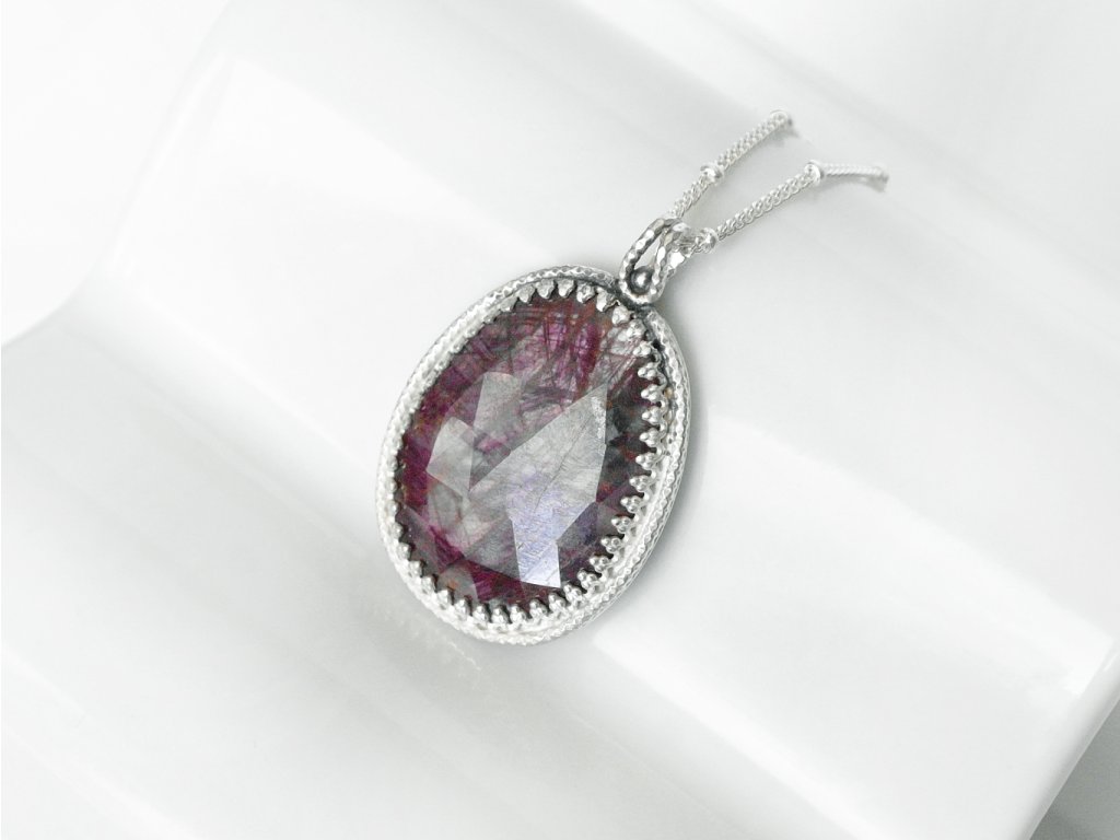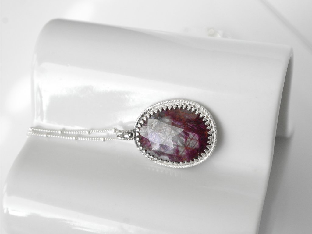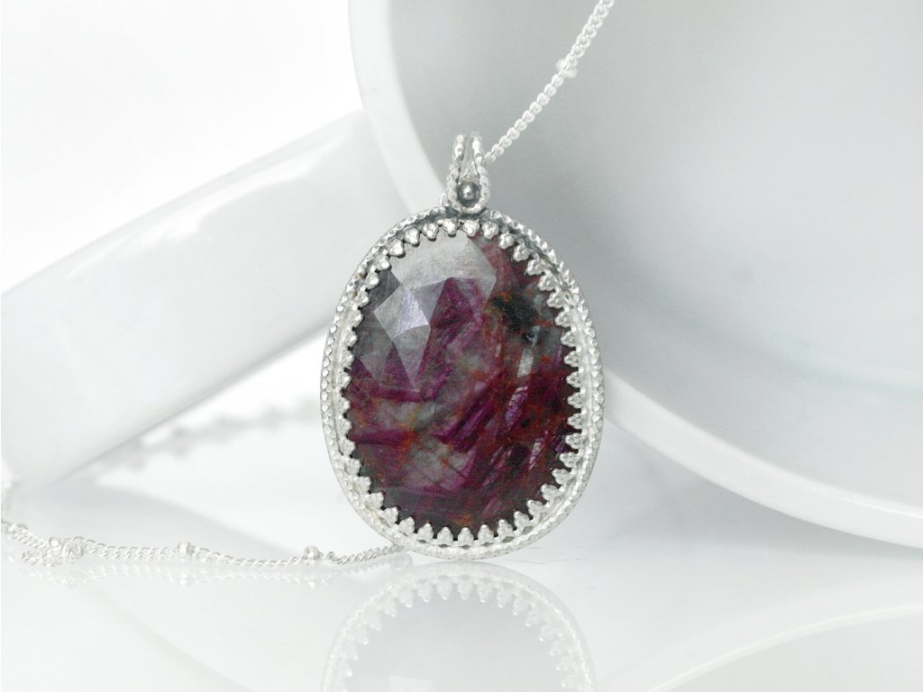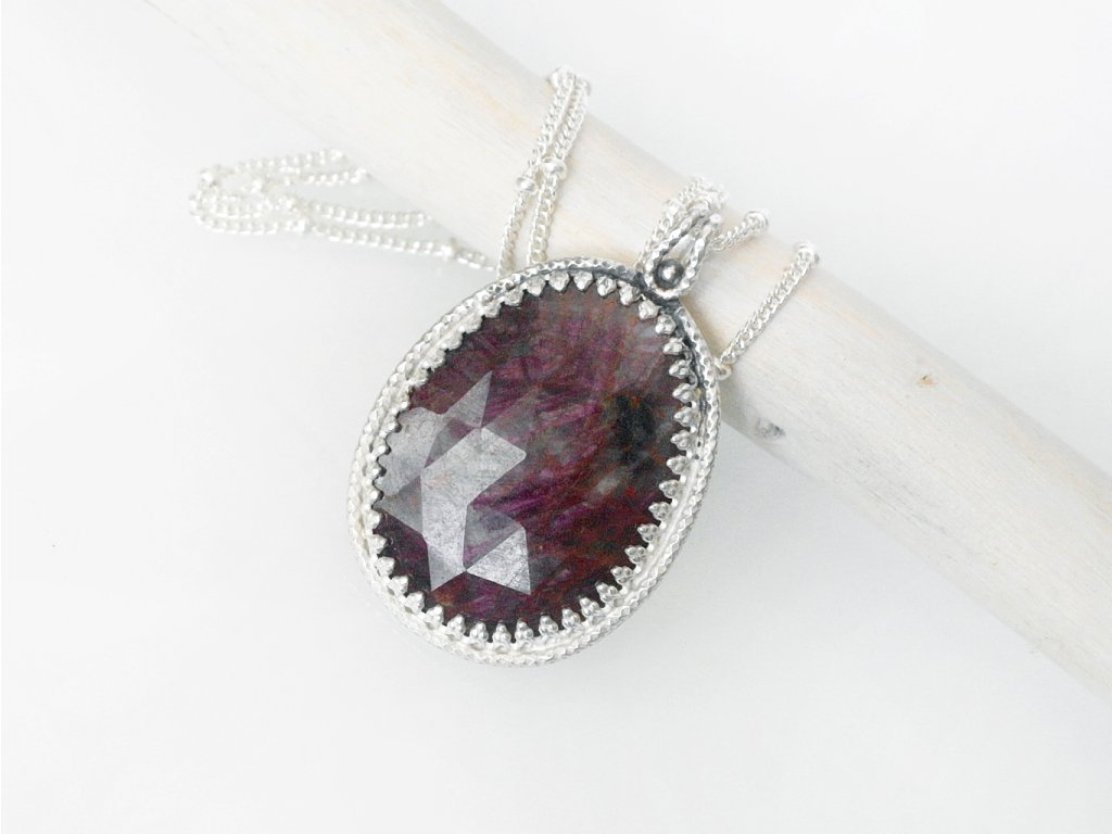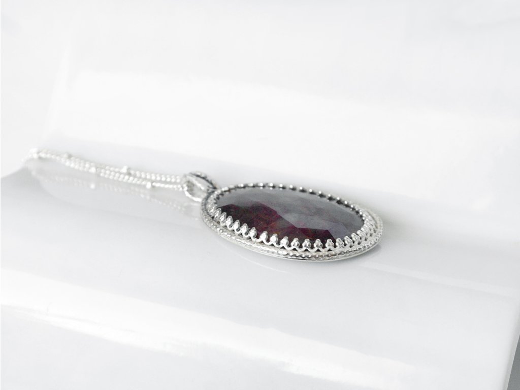- zafír je osadený v korunkovej obrube so zabrusovaným lemom, z ktorého je vytvorené aj očko na prevlečenie retiazky